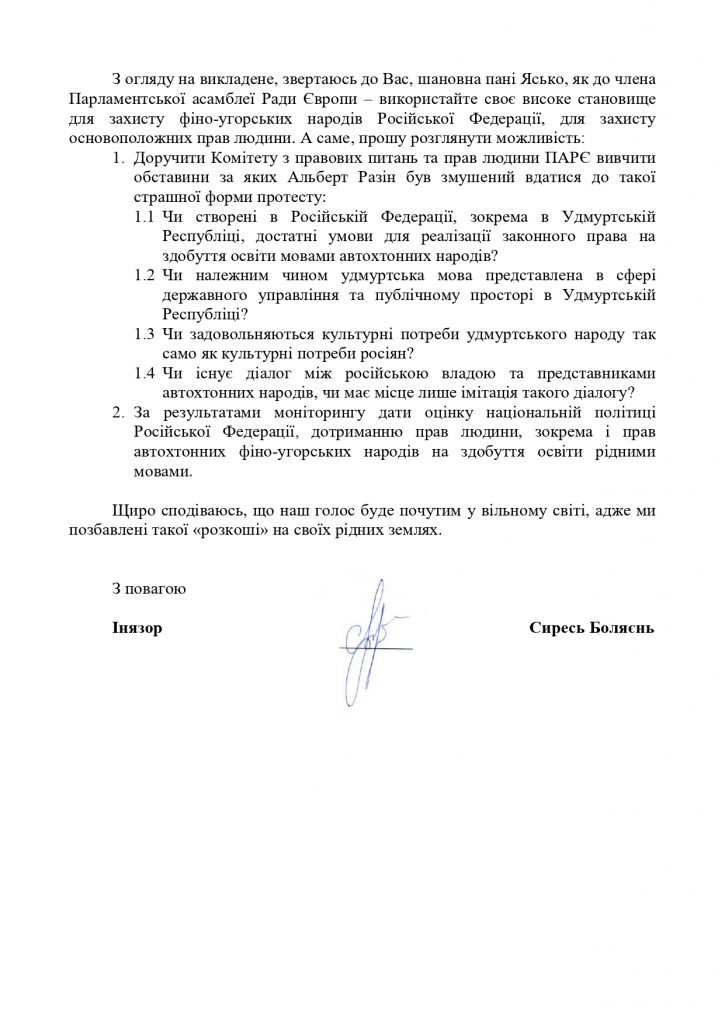 Lectäsynek, melät, kemence taštamkovoń čistěnt́, udmurtoń sodyeś (učönoeś) Aĺbert Razin pultyze ěś pränzo Ižkar ošsont́, Udmurtoń Parlamentěnt́ ikele. Vakssonzo kadovst́ transparantně, konatnesě son terdś ěś udmurtoń ětnosont́ idemanzo: «Buti vandy moń keleś jomi, mon anokan kuloms martonzo».