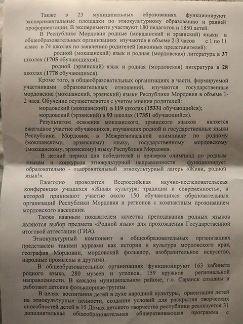 «Minenek pokškavtneź venkstäst́, kelät gimnazijatne dy universitetně ansäk ruzoń kuĺturant́ turtov. A ěrzätneń tkrtov ulit́ kurynet́ dy regionaĺnoj komponent «Miń ěrätano Mordovijaso». Ěrzänks tonavtomačint́ tarkas minenk altyt́ pert́peĺksěń večkicäń kurynet́ dy foĺklordo kortamot. Koda te istä lisi? Činovniktne madstit́ raśkent́ kalmozonzo dy natoj moda tov jortnit́. MIń terävttano liseme latkostont́, a minek karmavtyt́» – «Ton madt́ dy udok. A ěrävi «situacijant́ obosträt́» Te processěś «estestvennoj»! Mon nejan ansäk vejke vitnema te problemant́. Buti minek a mari rossijan kirdivieś, minenek mezejak a kadovi mastorütkoń raśketneneń pškademadont́ baška. Minek neĺgiź meĺtopavtomanok tonavtnems ěś tiriń ěrzäń keĺsě» – korty Jogań Mińka, vejkeś gimnazijań panžomado sörmań kučicätnede.